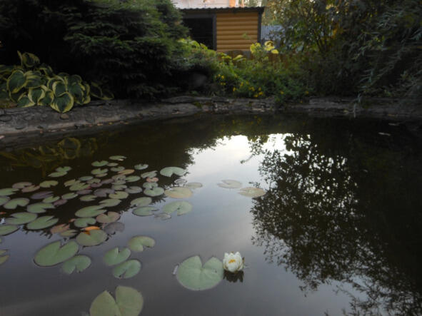 Перед прудом росли две яблони, а между ними круглый куст, весной покрывающийся белыми цветочками.