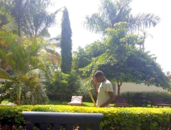 Так, почти же экватор. Даже за ним несмотря на пожёванность, я делал фотографии на телефон и снимки оправлял домашним, дразня их. Щёлк чёрный парень стрижёт кусты возле голубого бассейна. Щёлк за воротами гостиницы прошла стройная рослая темнокожая девушка с огромной корзиной бананов на голове. Щёлк наконец пришёл наш голубоватый официант с завтраком. Весьма скромным, надо отметить. Яичница, блинчики и на выбор чай или кофе. Пришлось сбегать в номер за баночкой детских мясных консервов «Тёма», всегда они меня выручают, вчера кормились так себе, есть хотелось невыносимо.