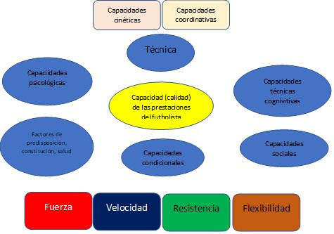 La figura muestra que las prestaciones del futbolista, o más bien su eficiencia en una competición, dependen de múltiples habilidades, capacidades y cualidades, que se influyen entre sí.