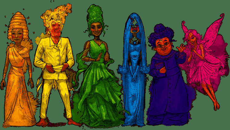СОВЕТ ФЕЙСовет стоит во главе Королевства фей и управляет Содружеством «Вечно и счастливо». Совет состоит из фей Розетты, Тангерины, Ксантуса, Эмеральды, Скайлин, Виолетты и Кораллы. Каждая фея олицетворяет собой один из цветов радуги и выполняет определенные задачи. Несмотря на то что совет изо всех сил старается поддерживать порядок во всех королевствах, все же их подход к правлению сильно устарел, из-за чего у фей часто возникают разногласия с близнецами Бейли.