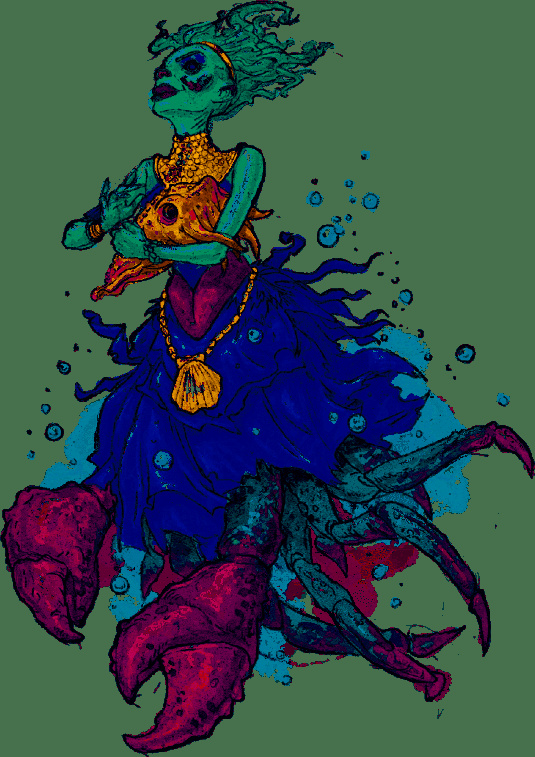 Морская ведьма известна тем, что превратила хвост Русалочки в человеческие ноги. Она живет в подводной пещере глубоко в океане. На жизнь она зарабатывает, оказывая волшебные услуги морскому народу и прочим созданиям. Однако если они не выполняют условия сделки, она берет их в плен навечно.