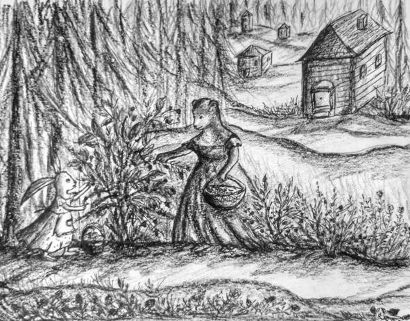 Пока Таптыжка находился в школе, Марфа брала самую большую плетёную корзину и отправлялась собирать малину, чернику, землянику или ежевику. Часто Василиса-краса помогала ей, тогда дело шло быстрее и веселее. Подруги болтали, а корзина незаметно наполнялась спелыми ягодами.