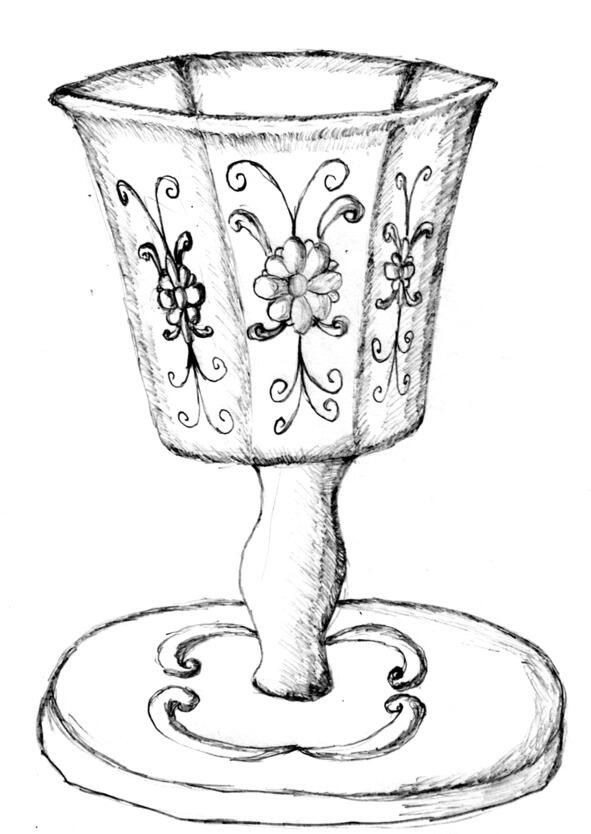 сосуд был похож на шестигранный стакан с расходящимися наподобие воронки кверху краями и подставкой в виде массивной пластины с утолщённой в средине ножкой