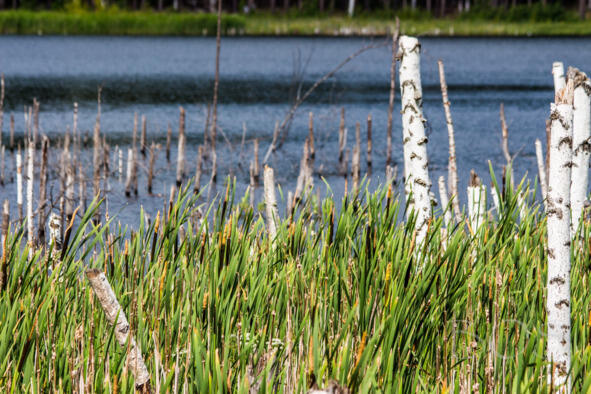 Купаться со всеми я не пошел, только ополоснул кеды, замазанные черной илистой грязью еще во время прохода через эту речку Бобровку. Вернее, даже не через нее саму, а через заболоченную низменную пойму. Мы скакали по кочкам и по веткам, в густых зарослях цветущего иван-чая едва находя тропу, ежесекундно чавкая ногами по грязи и черпая обувью эту вонючую жижу. Зайдя после походного обеда в воду, я пополоскал пропитанные грязью и потом кеды, не снимая с ног, огляделся. Левее нас начинались бескрайние заросли камыша, а из воды между ним торчали сухие обломки берез. Безрадостная картина. Эти погибшие в воде березы напомнили мне кладбище со старыми, покосившимися крестами.