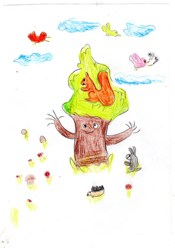 Знаю я всё про корни, буркнула Белочка. Я же говорю, это было тогда, когда даже животных не было в нашем лесу, очень давно. Не все деревья были такими, многие росли как обычные берёзы, дубы, такие же, как сейчас. А те, кто умёл двигаться и говорить, считались хранителями леса. Когда в лес пришли первые животные, они почтительно относились к Хранителям. Звери не строили в них дома и не рыли в их корнях норы, наоборот, они дружили. Часто можно было видеть, как белка беседует со старым дубом, или как медведь выспрашивает у берёзки, где в лесу поспела малина. Но однажды в лесу начался пожар. Всех охватила паника, звери бросились врассыпную, спасая себя и свои семьи. Остались только деревья. Хранители пытались спасти лес, своими корнями они затаптывали пламя. Многие звери кинулись на помощь, но что они могли сделать? Таскали из ручья воду в маленьких скорлупках, для пылающего огня это было как маленькая капелька. Тогда звери отступили и с безопасного расстояния следили за пожаром. Дедушка сказал, что этот пожар назвали «Великим пожаром». За всю историю леса не было такого пламени. Огонь полыхал несколько дней, затем стал затихать. Звери любили свой лес и постепенно стали возвращаться в свои дома. Хранители, сражаясь до последнего с огнём, сильно обгорели. Звери лечили их, поливали водой и замазывали раны глиной. Беда всех сплотила. Лисы стали рыть норы и пускали к себе белок, медведи разрешали волкам зимовать в их берлогах. И главное все вместе они пытались возродить лес. Высаживали молодые деревья, ухаживали за ними. Постепенно лес стал преображаться, вместо обгорелых палок появлялись молодые побеги. Животные снова расселились по всему лесу. Дед говорит, что после «Великого пожара» деревья Хранители перестали ходить и разговаривать. Постепенно жители леса забыли о Хранителях и строили свои дома в тех деревьях, где им нравилось. Возможно, наши с вами дома построены как раз в таком дереве?