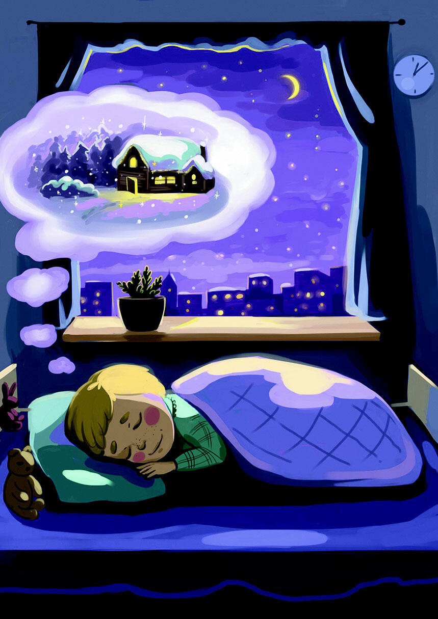 Huoneessaan hän uneksi retkestä mummolaan.