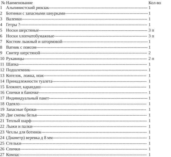 Из всего списка 14 пунктов (больше половины) это предметы одежды. Всё продумано. Всё продублировано. Кто-то из исследователей удивлялся, что слишком много белья было обнаружено в палатке. Всё по списку. Зимой в лесу одежды много не бывает.