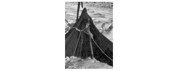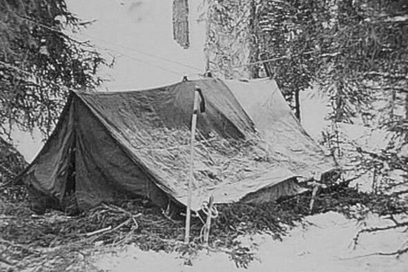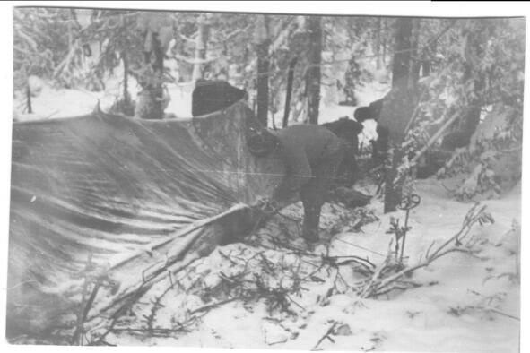 Фото 8. Здесь явно видны растяжки, которые крепятся к деревьям. (Откуда эта фотография пока неясно. Очень похожа на палатку Игоря Дятлова. Однако, вероятно, к данному походу отношения не имеет.)