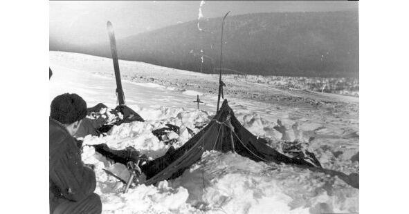 Из протокола допроса свидетеля Темпалова Василия Ивановича от 18 апреля 1959 года, листы 310 312: « Палатка была растянута на лыжах и палках, забитых в снег, вход ее был обращен в южную сторону, и с этой стороны растяжки были целы, а растяжки палатки с северной стороны были сорваны и вся вторая половина палатки была занесена снегом. У палатки был обнаружен ледоруб, запасная пара лыж».