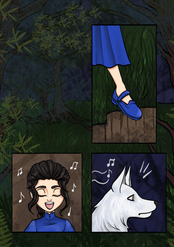 В это самое время мимо недалеко пробегала стая волков. Волки услышали песню и пошли на голос. Эти волки были очень красивые, сильные и добрые, а песня была настолько прекрасна, что они решили помочь обладателю столь красивого голоса. И стая подошла к яме и увидела в ней маленькую красивую девочку. Когда волки увидели яму и кто в ней сидит, сразу поняли, чьих это дело рук, они неоднократно сталкивались с Шабаном. И всегда старались бороться с ним, а даже, скорее всего, с его злыми делами. Шабан всегда добрым людям старался навредить, вот такой у него был вредный характер. Они спустились в яму и встали друг другу на спины, чтобы Лейла смогла по ним выбраться. Она встала одному волку на спину, потом другому и так выбралась из ямы. А волки решили, что обязательно проводят девочку до дома, чтобы злому волшебнику было сложнее делать пакости. Они прошли через лес и вышли на берег, через который был брошен верёвочный мост. Когда они подошли к мосту, то увидели, что он наполовину разрушен. Это всё ещё были проделки Шабана. Тогда стая решила, что переплывёт реку, а девочку можно перевезти на спине, чтобы она не промокла. Лейла в благодарность своим друзьям пела им весёлые песенки, от которых дорога становилась не просто легче, но и короче.