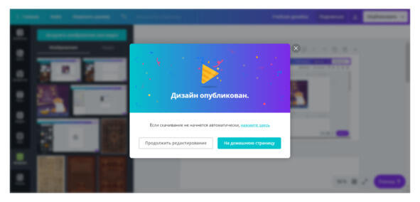 If everything is done correctly, the download of the design will begin. When it is ready, you will see a pop-up window with the inscription Design published, see the screenshot.