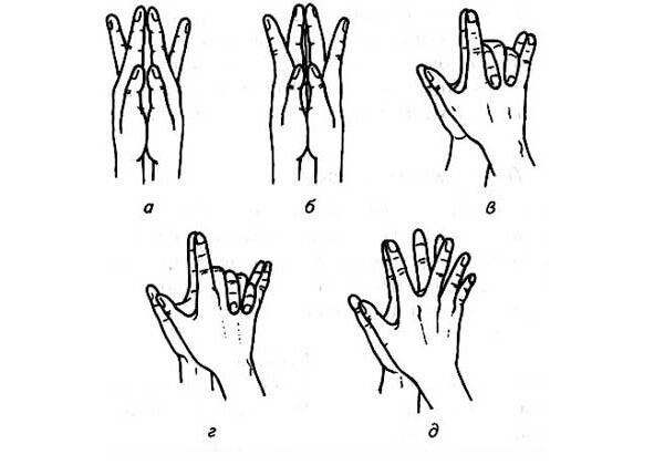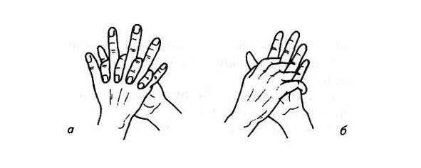 8. Пальцы сцеплены в замок. Концы пальцев левой руки нажимают на верхнюю часть тыльной стороны ладони правой руки, прогибая ее так, что пальцы правой руки встают, как петушиный гребень (а).