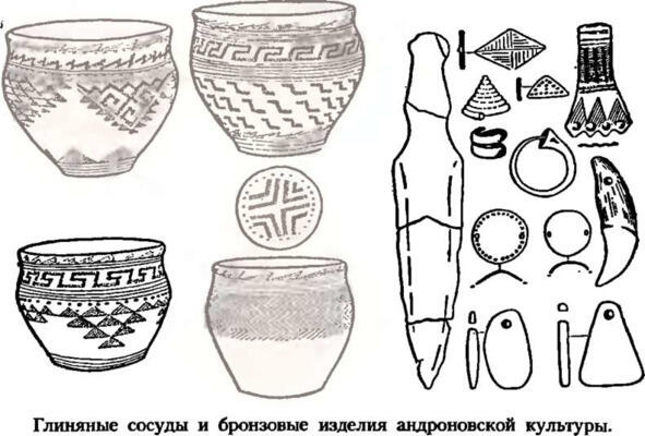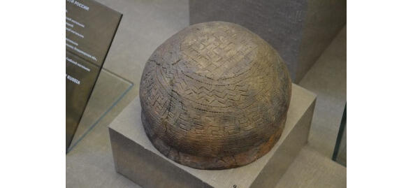 From left to right: vessels with an attributed pattern in the form of a meander and a swastika. Andronovo culture, 12th-century Rugen island, Pozdnyakovskaya culture, GIM.