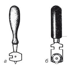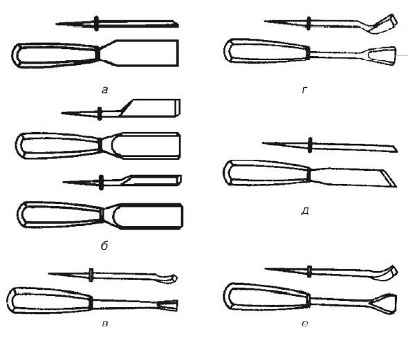Зачистные и профильные операции обычно выполняются столярными стамесками прямыми (плоскими) и полукруглыми (рис. 1.27, а, б). Для резных и токарных работ набор богаче. Так, для выборки узких канавок используют стамеску-уголок (в), для вырезания узких жилок церазик (г), геометрического орнамента косячок (д), для рельефной резьбы в труднодоступных местах клюкарзу (е).