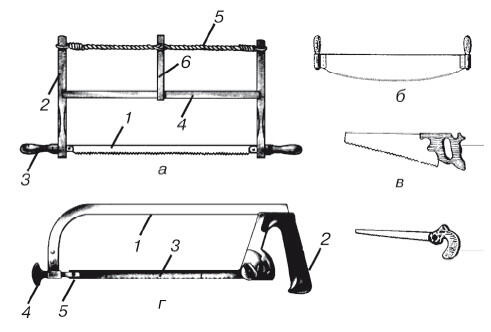а лучковая с деревянным лучком(1 пильное полотно; 2 стойка; 3ручка; 4распорка; 5 тетива; 6закрутка); б поперечная двуручная; в ножовая (ножовка) обычная и узкая; г ножовка по металлу(1 металлический станок (дуга, скоба); 2ручка; 3 пильное полотно;4 натяжной винт; 5 штифт для крепления полотна)