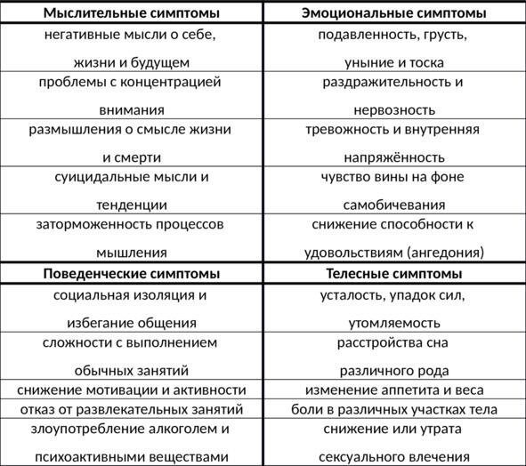 Главные симптомы депрессии, сгруппированные по принципу их принадлежности к когнитивной, эмоциональной, телесной и поведенческой сферам, в наглядном и доступном виде представлены в нижеприведённой таблице (см. таб. 1).