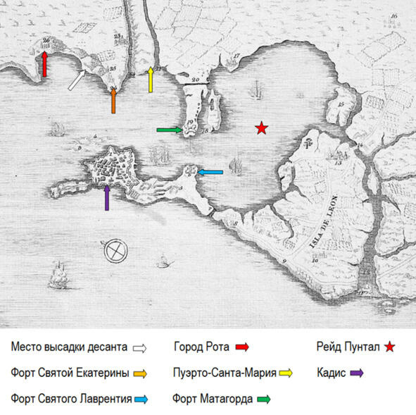 Форт Матагорда с ходу взять не удалось, и его осада затянулась. Поэтому адмирал Рук высказал опасение, что если форт все же удастся захватить, другой форт (Святого Лаврентия) на противоположном берегу не позволит флоту войти без тяжелых потерь на внутренний рейд порта Кадис.