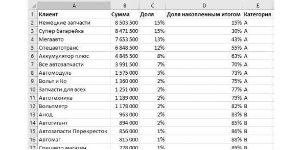 Если вы сложите в столбце «С» проценты по клиентам от строчки 2 до строчки 11, вы получите 80%. Данные постоянные клиенты совокупно принесли нашей компании в течение года 80% всего объема продаж. Это клиенты категории «А».