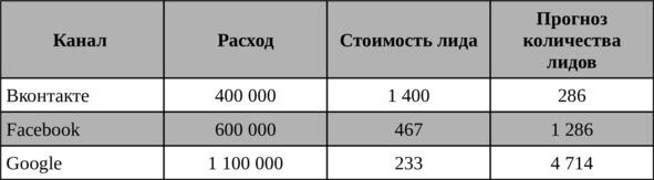 Нами уже была посчитана стоимость лида (в варианте отсутствующей системы сквозной аналитики). Берем данные значения. Перераспределяем рекламный бюджет в сторону канала Google, так как данный канал показывает самую низкую стоимость лида. Далее делим размер рекламного бюджета (колонка «Расход») на стоимость лида и получаем прогнозное значение по ожидаемому количеству лидов из каждого рекламного канала.