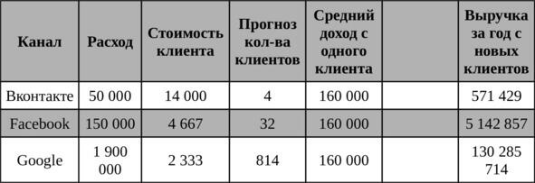 Например, таким образом. В нашем примере наименьшая стоимость клиента была в рекламном канале Google. Соответственно, мы и перераспределим рекламный бюджет, который составляет в нашем пример 2 100 000 рублей (по 700 000 рублей на каждый канал, см. таблицу выше) в сторону данного канала следующим образом.