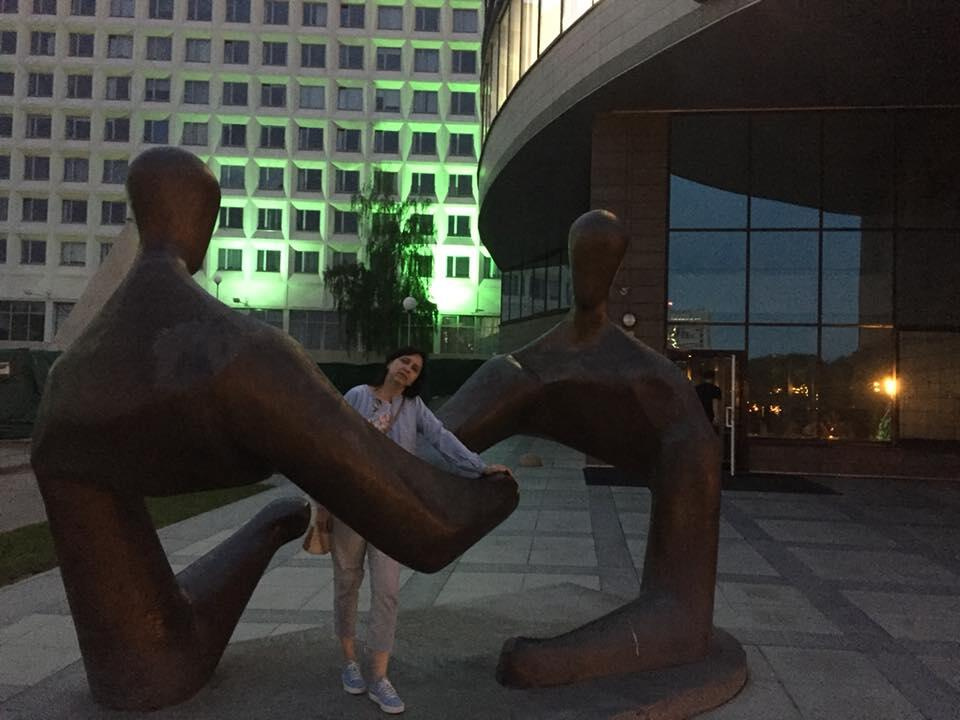 Делаю первое фото супруги на фоне «Планеты». Второе поодаль, рядом с двумя какими-то «футуристическими» фигурами, протянувшими навстречу друг другу то ли руки, то ли ноги. Плоскость здания за спиной супруги в ярком пятне изумрудно-зелёной подсветки. Кажется, фоном служит другая гостиница, не помню её названия (но кто-то по фото наверняка узнает и знакомым «пейзажам» обрадуется).