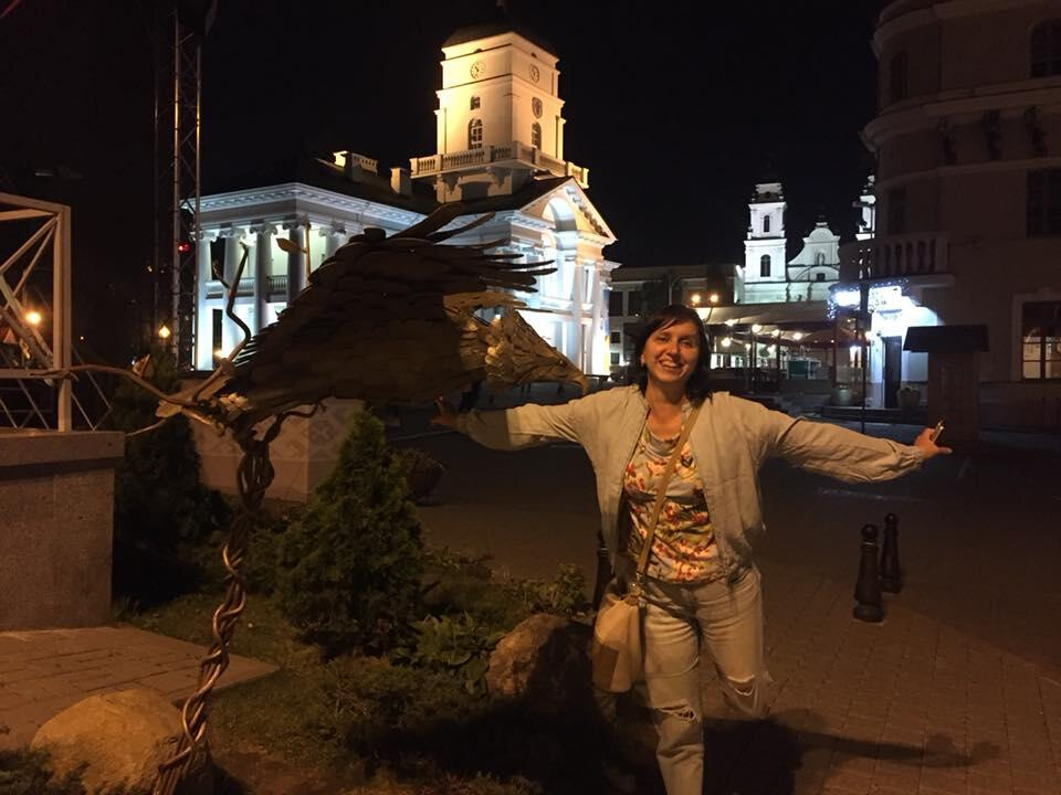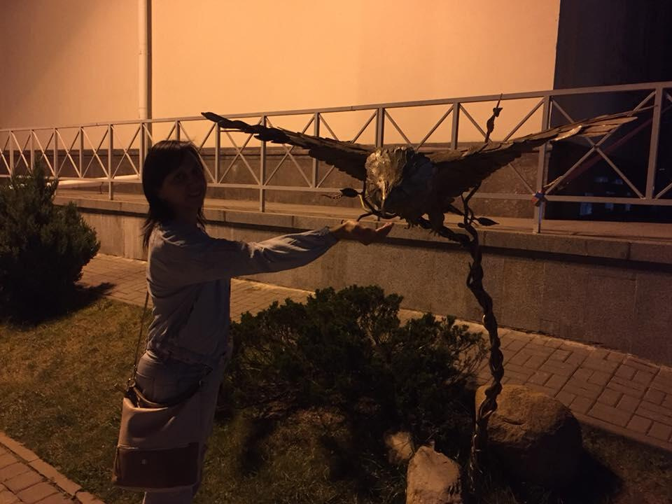 Ба! А вот и чешуйчатая металлическая птичка возле церкви Святого Духа. Впрочем, для птички она чересчур велика. Пусть будет птица. Или матёрая «птичища»! Орёл! Или орлица дилетанту-неорнитологу сложно определить пол пернатого. «Раненая птица в руки не давалась, раненая птица птицей оставалась». Впрочем, птица была не раненая, а чугунная, в крайнем случае бронзовая. Ан нет! Не бронзовой, не раненой, а кованой (легко и приятно совмещать-склеивать «тёплое с мягким»)! А значит, всё-таки чугунной. Из числа тех «сакральных скульптур», которым в Минске несть числа. Впрочем, все они счётны. Можно поперечислять: «Войт/глава магистрата с ключом» («с ключом и сыну ключ сумел доставить»), «Городские весы», «Незнакомка», «Ассоль», «Прикуривающий», «Дама с собачкой», «Фотограф», «Лошадь и воробей», «Торговка семечками» (она же «Баба Рая»). Продолжать не буду, ибо перечисление почти закончил. Но большинство из списка «сакральностей» мы с женой не увидели: мимо не проходили, не пробегали и рядом не постояли. Из того, что проходили и видели это памятник главе Магистрата (собственно говоря, на него взирали прямо из «Гамбринуса») и «Городские весы» (эти как раз напротив ресторана «У Ратуши», куда нас норовила заслать-сбагрить Ира Мальгина, чтобы мы поэкономили и послушали там живую музыку).