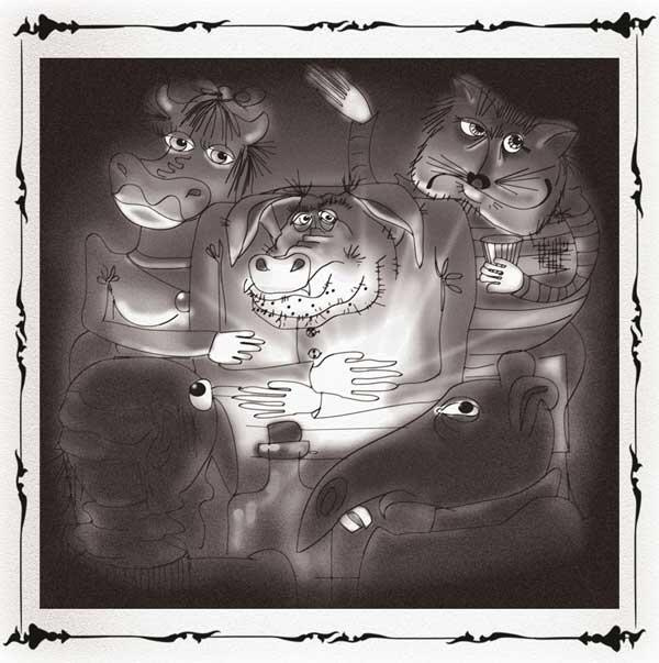 Так и потеряли они всякую надежду стать прежними, человеческими. Мало-помалу устроились на работу кто куда: Девушка-Корова стала славной дояркой, коровы её просто обожали; Человек-Кот нанялся танцовщиком в ночной клуб, а Человек-Индюк и Человек-Крыса охранниками в банк.
