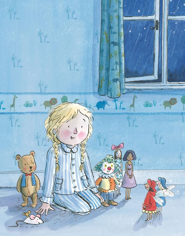 И все игрушки отправились в детскую. Флора крепко спала в своей кроватке, и мишутка не сразу сообразил, как же её разбудить. Наконец он похлопал девочку по руке, высунувшейся из-под одеяла. Но Флора не проснулась. Тогда клоун взялся за уголок одеяла и немного подёргал. Это разбудило девочку.