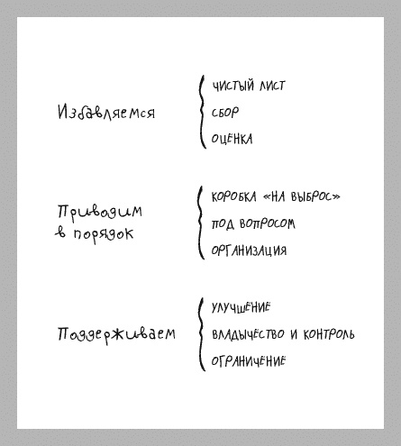 Почти безо всяких усилий вы получите чудесное свободное пространство. Разве это не прекрасно? Теперь будет легче избавиться от каких-то вещей, чем сложить их обратно. Чтобы сохранить что-то, вам нужно определить, почему эта вещь находится здесь, а потом физически вернуть ее на место. Это труднее, чем просто засунуть в мешок и выбросить.