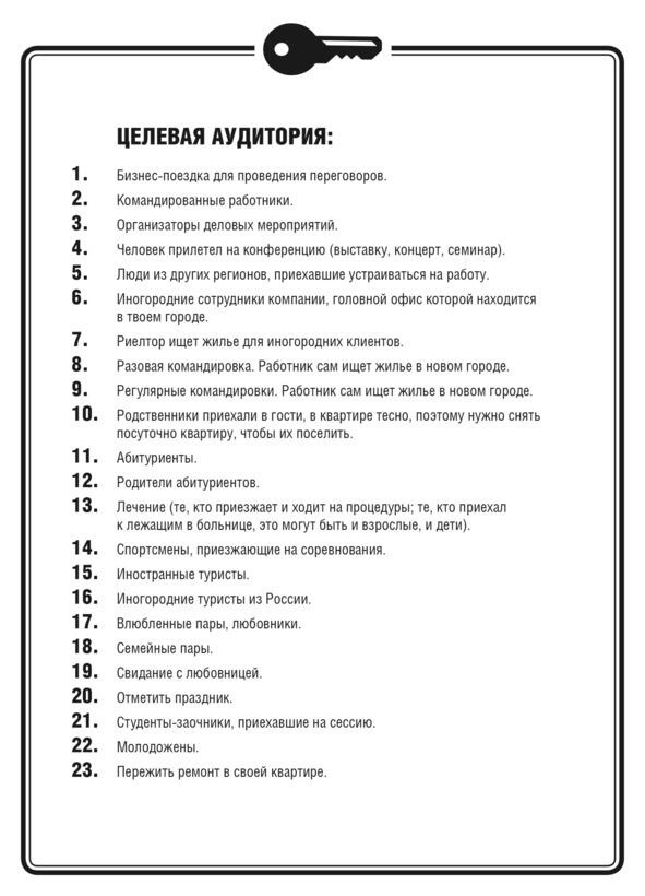 Как узнать, пользуются квартиры спросом именно в твоем городе или нет, ты сможешь, прочитав главу «Анализ рынка». А вот узнать, кто именно снимает квартиры посуточно, можно уже сейчас.