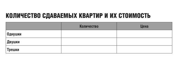 Сначала выписываешь общее количество квартир, потом сколько по отдельности одно-, двух-, трехкомнатных (и более). Это нужно для понимания сегмента, в котором ты будешь работать. В Питере, например, трешки, четырехкомнатные и пятикомнатные нормально сдаются, но только в центре. У нашей компании в центре бОльшая часть трешек, потому что по результатам года конверты с прибылью от них всегда пухлее, чем от однушек. Да, они не так стабильны, как однушки. И рисков больше, но мы любим пить шампанское!