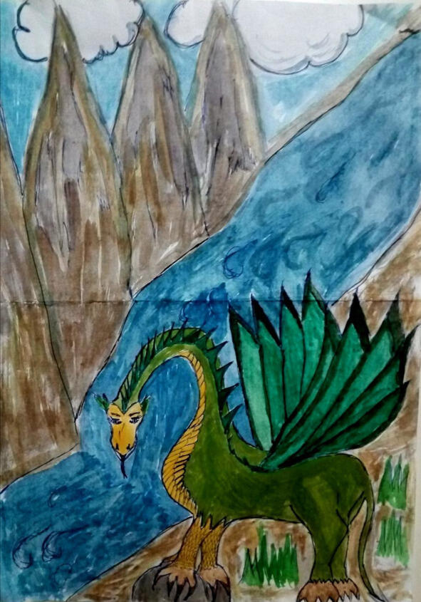 Дойдя до её самого центра, они увидели спящего, свернувшегося клубочком, дракона, мирно посапывающего как котёнок. Глядя на него в этот момент даже было трудно себе представить, что он творит такие страшные дела. Прилетает в деревню каждые 100 лет.
