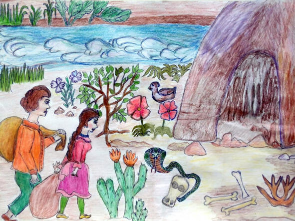 Папа, папа! кричала она на ходу, выбегая из пещеры и, подбежав к отцу в торопях, стала рассказывать ему о том, как она пробралась внутрь горы, и то, что она там увидела и услышала.