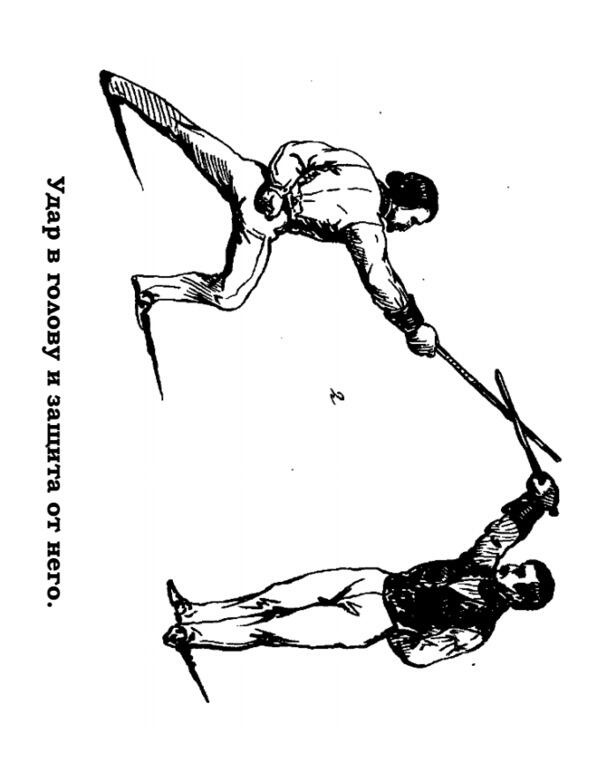 Рука поднимается вперед и вверх одновременно с отводом правой ноги назад. Кулак впереди справа, так, чтобы удар не достиг его, а палка направлена по горизонтали влево, защищая левое плечо.