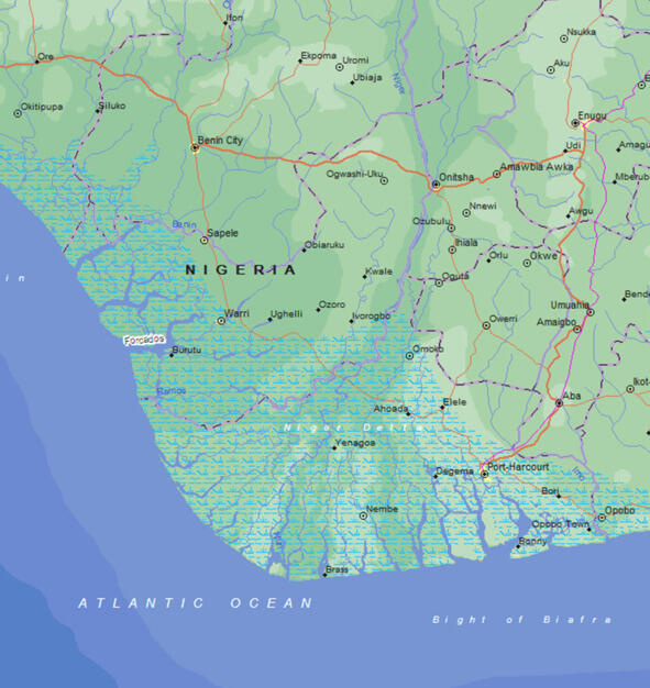 На расстоянии девяноста миль (140 км) от моря река Форкадос отделяется от основного русла Нигера, и течет на запад, другой рукав Нигера от этого места течет на юго-юго-запад и называется рекой Нан. Здесь река расширяется до 800 ярдов (720 м). Берега рек, которые в некоторых местах поднимаются на высоту от 20 до 30 футов (6 9 м), становятся менее лесистыми, а деревья имеют меньшую высоту. В этой стране обитает народ ибос, люди низкого роста. Они занимаются сельским хозяйством и выращивают ямс, рис, кукурузу, бананы и добывают пальмовое масло, а также разводят в небольшом количестве коз, овец и птиц.