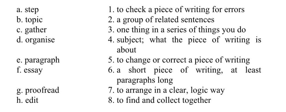 1. These words are important for understanding the writing process. Match each word with the correct definition.