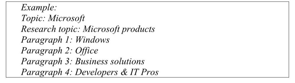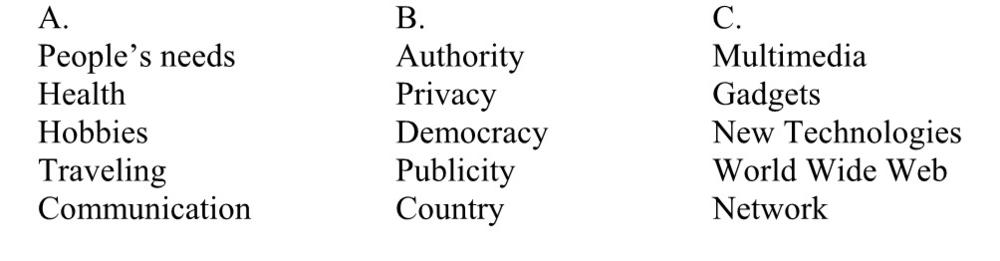 2. Choose one topic from each of three groups. Narrow each of the three down to a research topic. Then think of three-five titles of paragraphs in the research paper. Compare with your partner.
