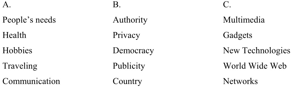 4. Choose one topic from each of three groups. Brainstorm one of the topics (list as many ideas as you can in five minutes), make pattern notes to the second topic (use any resources you can) and map the third topic. Share your notes with partners.