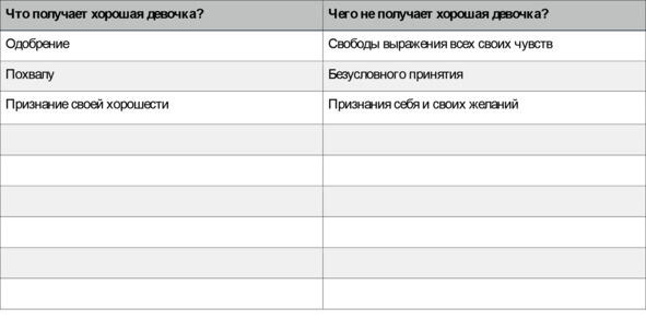 Приглашаю вас стать соавторами книги и заполнить таблицы снизу. Делая это, вы сможете глубже проникнуться темой и прочувствовать смысл. Более того, я полагаю, что большую часть читателей составят женщины, и делаю максимальный акцент на них. Но на самом деле, будь вы мужчиной или женщиной, именно заполнение обеих таблиц дает возможность увидеть картинку не однобоко, а рассмотреть ее с разных ракурсов. Побудьте немного эмпатами, прочувствуйте эти роли и увидьте не только фасад, но и то, что скрывается за ним.