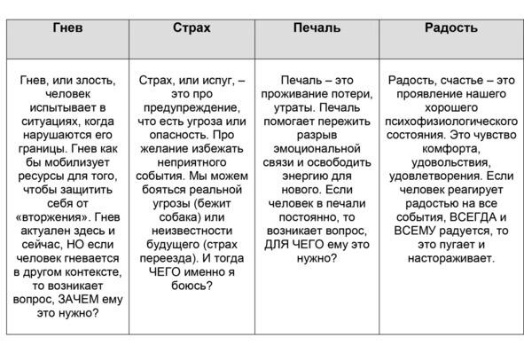 Итак, существует несколько базовых чувств: гнев, страх, печаль, радость. Базовые они потому, что их испытывают все люди! Более того, все эти эмоции нам жизненно необходимы.