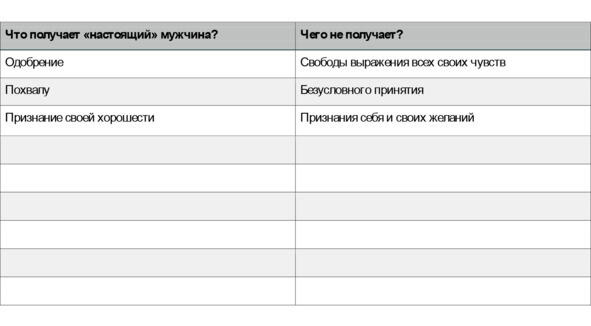 Кто-то мог подумать, что в таблицах допущена ошибка, слова повторяются. Это сделано намеренно. И это одна из важнейших мыслей этой книги, которую я хочу донести до вас. В отношениях, где нет равноправия, где женщина и мужчина становятся заложниками определенных ролей и образов, страдают и теряют оба партнера!