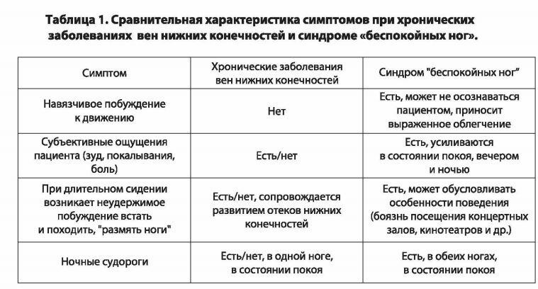 При наличии жалоб у таких больных прежде всего необходимо дифференцировать проявления хронических заболеваний вен нижних конечностей от иной патологии (остеохондроз пояснично-крестцового отдела позвоночника, деформирующий остеоартроз, сердечная недостаточность, плоскостопие, «синдром беспокойных ног»). Следует помнить, что у одного и того же человека одновременно с хроническим заболеванием вен нижних конечностей могут быть и иные заболевания, отягощающие их. Боль важный субъективный симптом, встречающийся на ранних стадиях хронических заболеваний вен нижних конечностей. Это одно из наиболее неприятных ощущений, которое может носить различную эмоциональную окраску, меняющуюся под влиянием различных факторов. Как правило, венозную боль описывают как «жгущую», «распирающую», «пульсирующую» и «дергающую». Следует подчеркнуть, что именно боль часто служит основной причиной обращения человека к врачу. Не следует забывать, что у ряда пациентов боль в ногах может быть обусловлена неврологическими расстройствами. В частности, она может быть проявлением так называемого «синдрома беспокойных ног». Синдром беспокойных ног представляет собой сенсомоторное расстройство, характеризующееся неприятными ощущениями в нижних конечностях, которые появляются в покое (чаще в вечернее и ночное время), вынуждают больного выполнять облегчающие движения, часто приводят к нарушению сна. Ведущим проявлением этого синдрома служит непреодолимое желание совершить движение ногами, которое больной может не осознавать или внутренне ему сопротивляться. И тогда ведущими жалобами становятся субъективные ощущения пациента (зуд, покалывания, боль, судороги). Отличия симптомов при хронических заболеваниях вен нижних конечностей и синдрома беспокойных ног приведена в таблице 1.