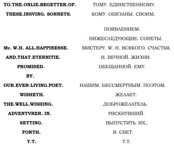Еще большая интрига в посвящении этого издания, подписанном буквами «Т.Т.», т. е. инициалами издателя Томаса Торпа, где после каждого слова стоит точка, в результате чего текст как будто вбивается в мозг отрывистым стаккато, гипнотизируя и протягивая невидимую ниточку для разгадки неведомого и таинственного Mr. W.H., которому эти сонеты и посвящены.