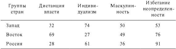 Таблица 1. Показатели культурной специфики стран Запада и Востока (по Хофстеде)