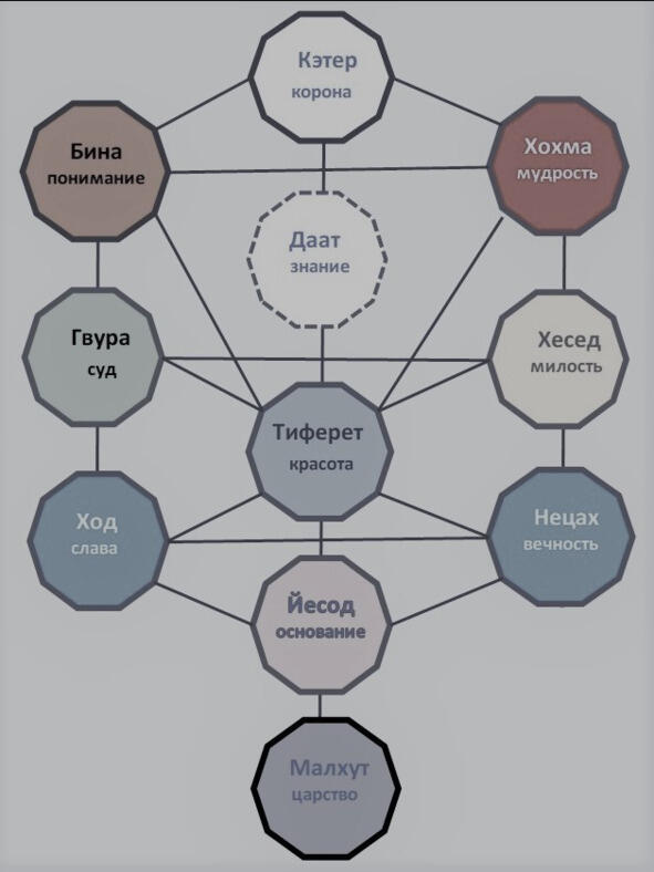 Вениамин Осипович, если вам любопытно, я вам поясню. Перед вами дерево жизни, пробасила вежливо младшая дама. Здесь изображены десять сфирот и не-сефира Даат. Каждая сефира означает свойство мироздания. Например, Тиферет символизирует красоту и любовь, а Йесод основание. Соседка показала пальцем на два центральных кружка.
