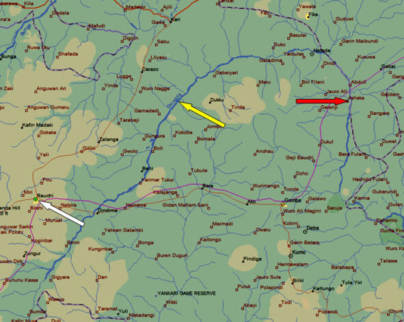 Баучи (белая стрелка), река Гонгола (желтая стрелка), Ашака (красная стрелка). Расстояние от Баучи до Ашаки 145 км.