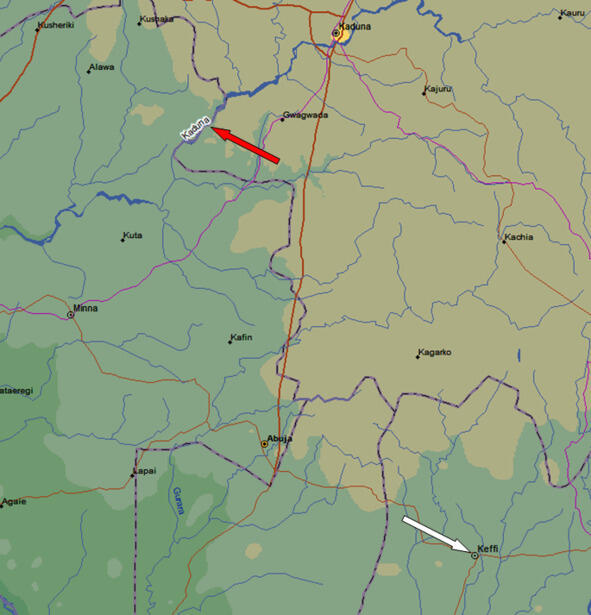 Река Кадуна (красная стрелка), Кеффи (белая стрелка). Расстояние между этими объектами 120 км.