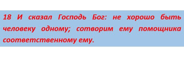 Под словами «не хорошо быть человеку одному» подразумевается, что человек в одном теле не справлялся с процессом воспроизводства жизни, ему нужен был помощник, по своим характеристикам идентичный ему.