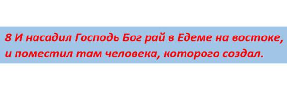 Слово «насадил» означает формирование сбалансированного интенсивного энергетического поля жизненной энергии Ци. Слово «рай» обозначает комплекс энергетических и природных условий, при которых жизнь может зарождаться и существовать на базе внешней энергии, не затрачивая усилий на её получение. Местность Едем, вероятно, подходила для этой цели, поэтому и была выбрана для насаждения рая. Помещать туда человека потребовалось для адаптации его к условиям жизни на планете, которые были более суровыми чем в раю.
