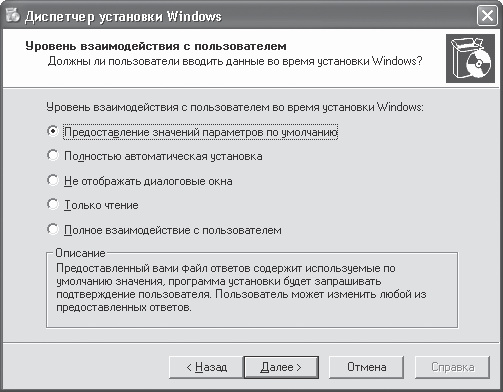 Предоставление значений параметров по умолчанию. При выборе данного положения все значения в файле ответов будут заданы по умолчанию. Мастер установки будет использовать эту информацию, автоматически подставляя ее в соответствующие поля, однако пользователю необходимо будет каждый раз подтверждать ее. Таким образом, при таком варианте создания файла ответов установка системы не будет автоматизирована полностью.